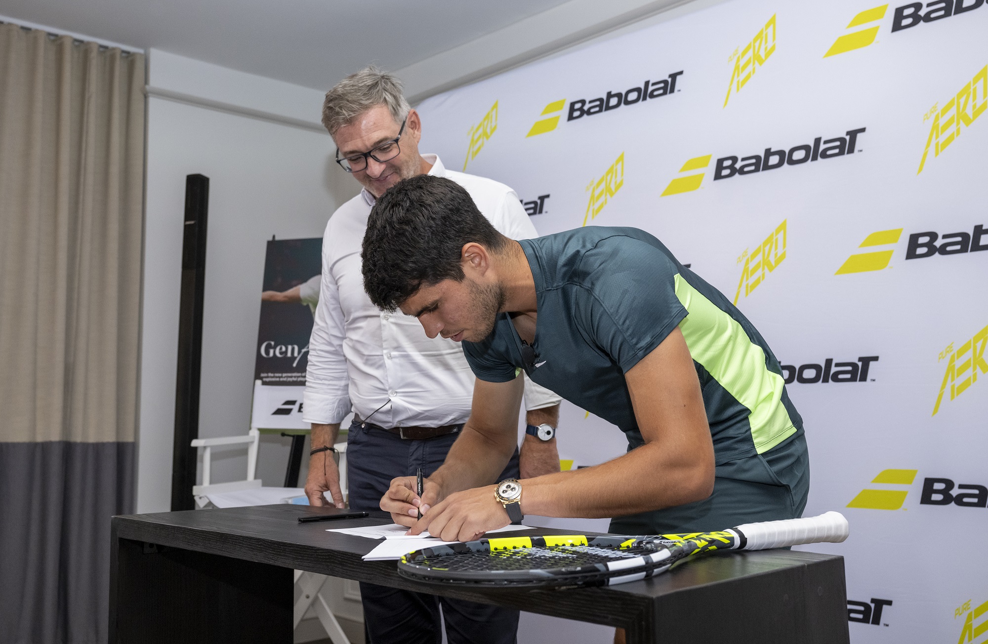 Carlos Alcaraz et Éric Babolat en août 2023 lors du renouvellement du contrat / ©Babolat